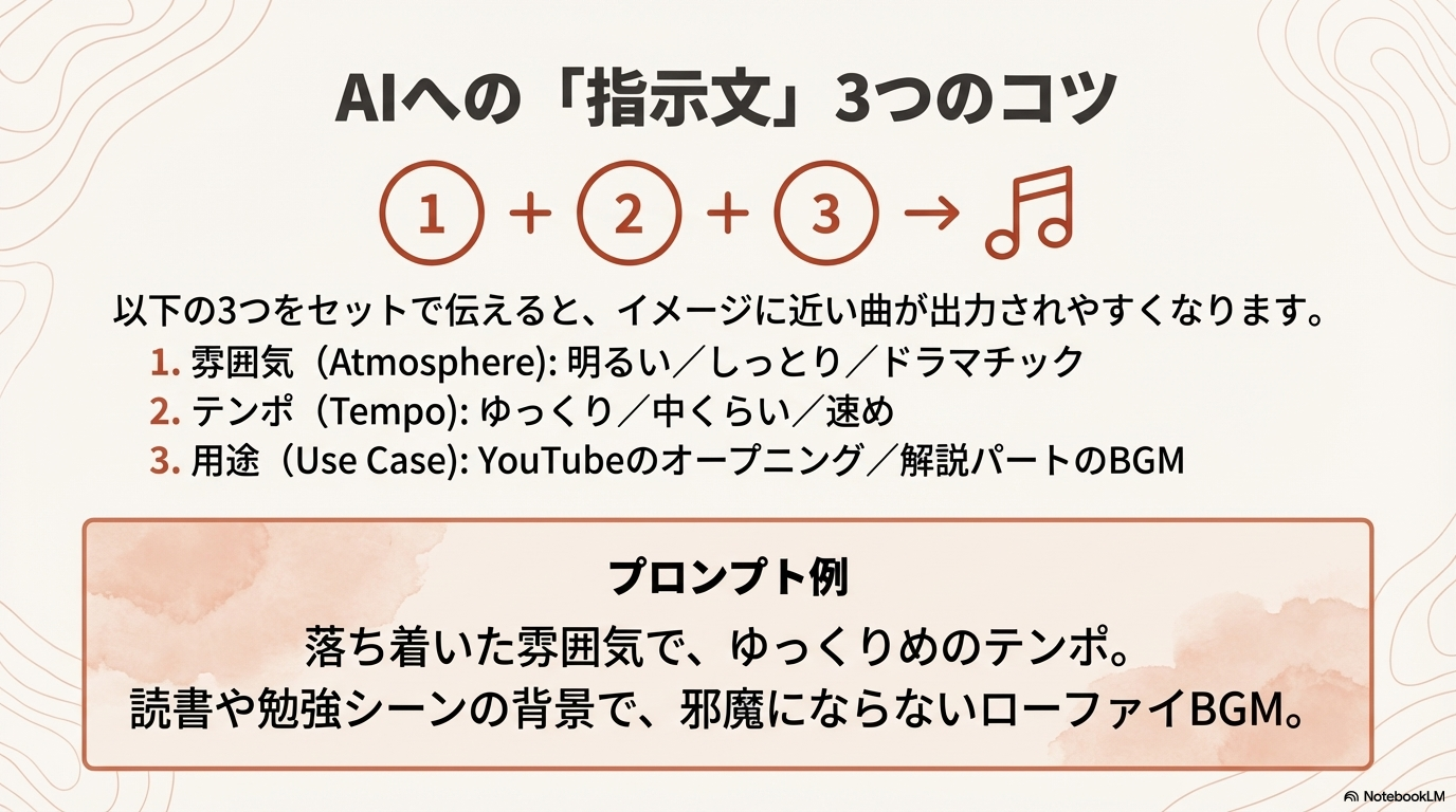 AI音楽へのプロンプトは、以下の3つをセットで伝えると使いやすい曲が出やすくなります。