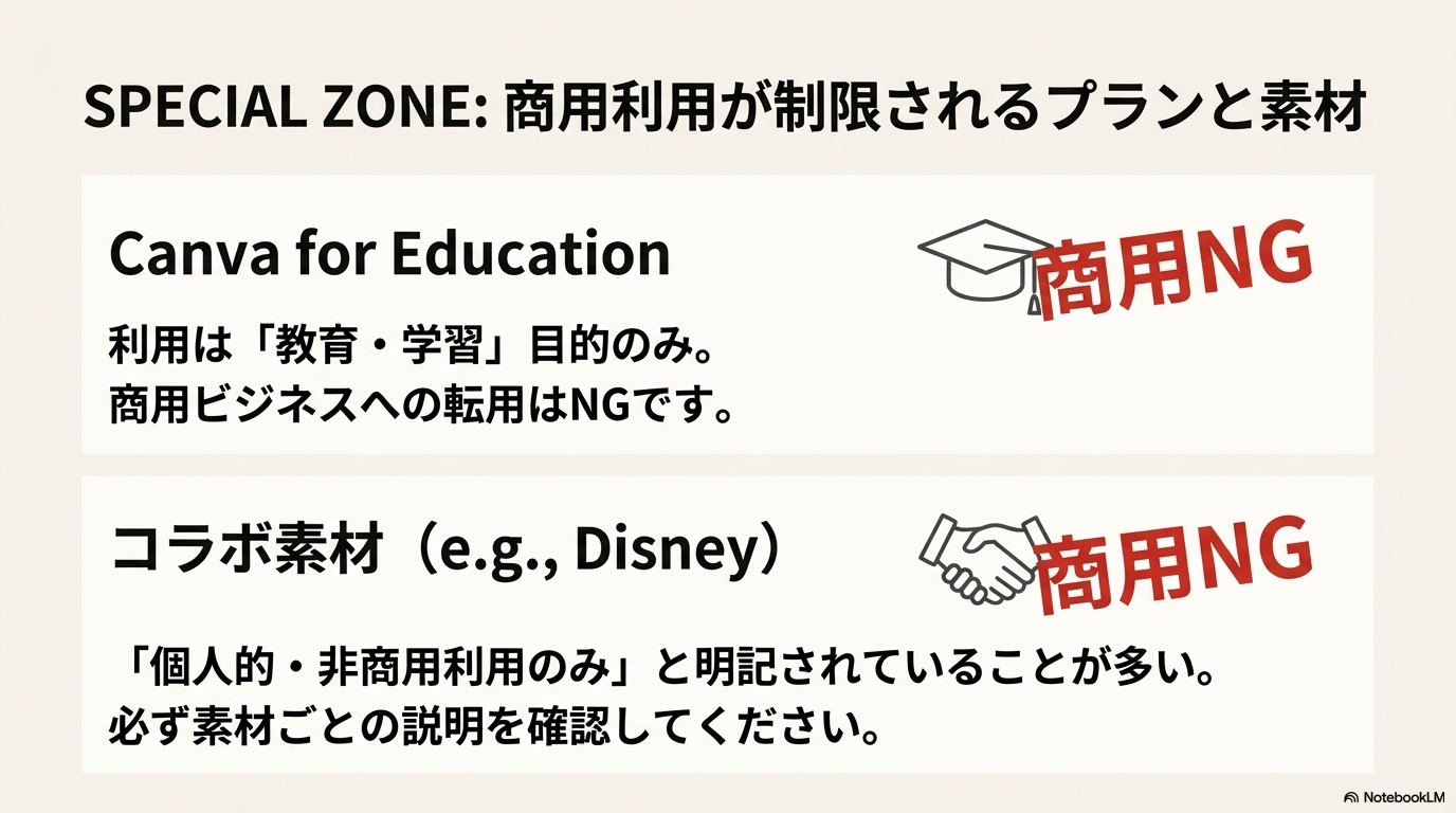 Canvaには、たまに有名ブランドやキャラクターとのコラボ素材が登場します(例:Disneyコラボなど)。 こうした素材は「個人的・非商用利用のみ」と明記されていることが多いです。