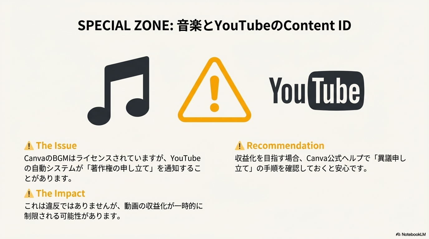といった影響が出る可能性があります。 YouTubeで収益化を狙う場合、Canva内の「Audio」のライセンス説明を確認するか、もし権利主張が来た場合の「異議申し立て」の手順(Canva公式ヘルプに記載があります)を知っておくと安心です。
