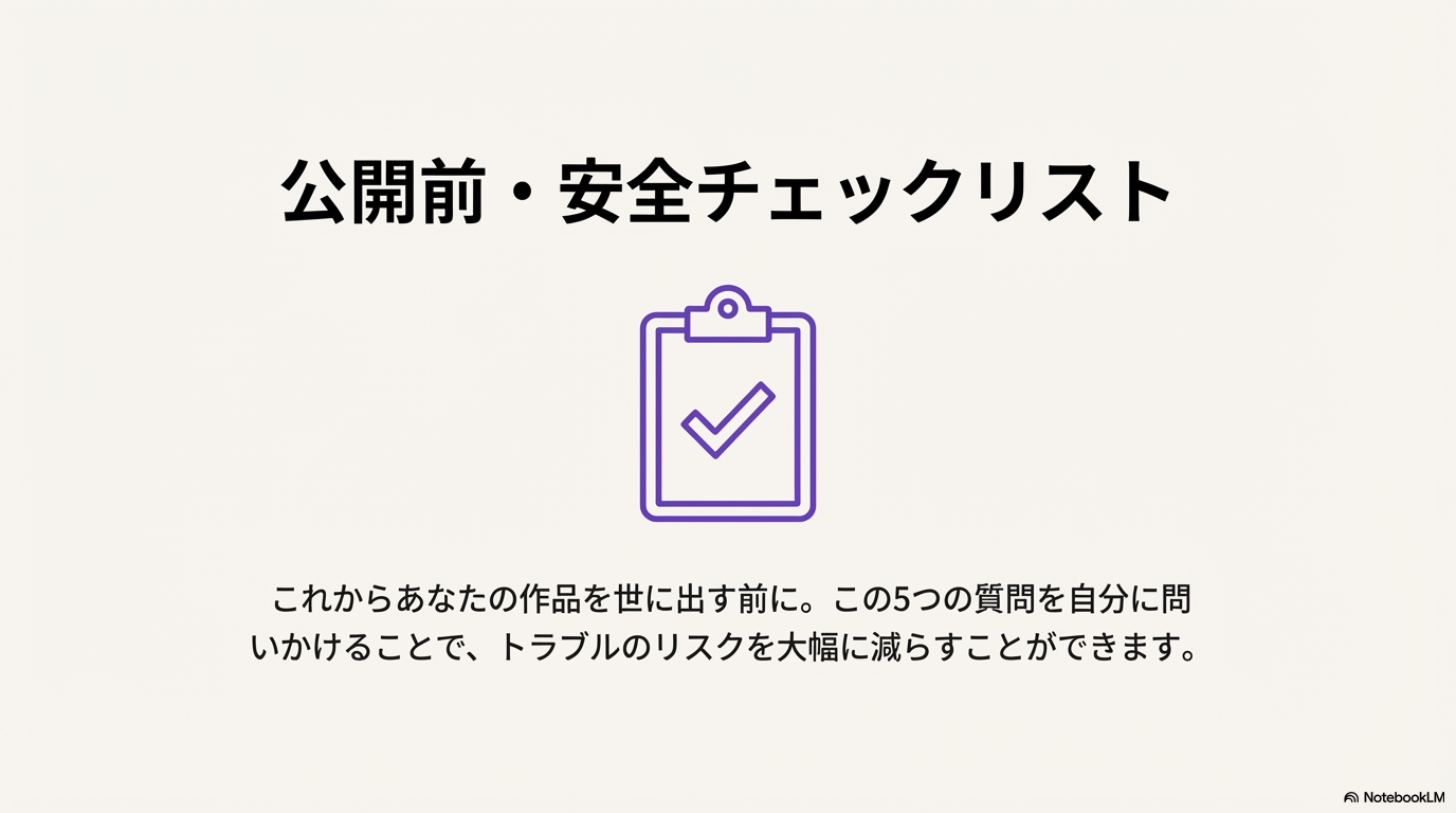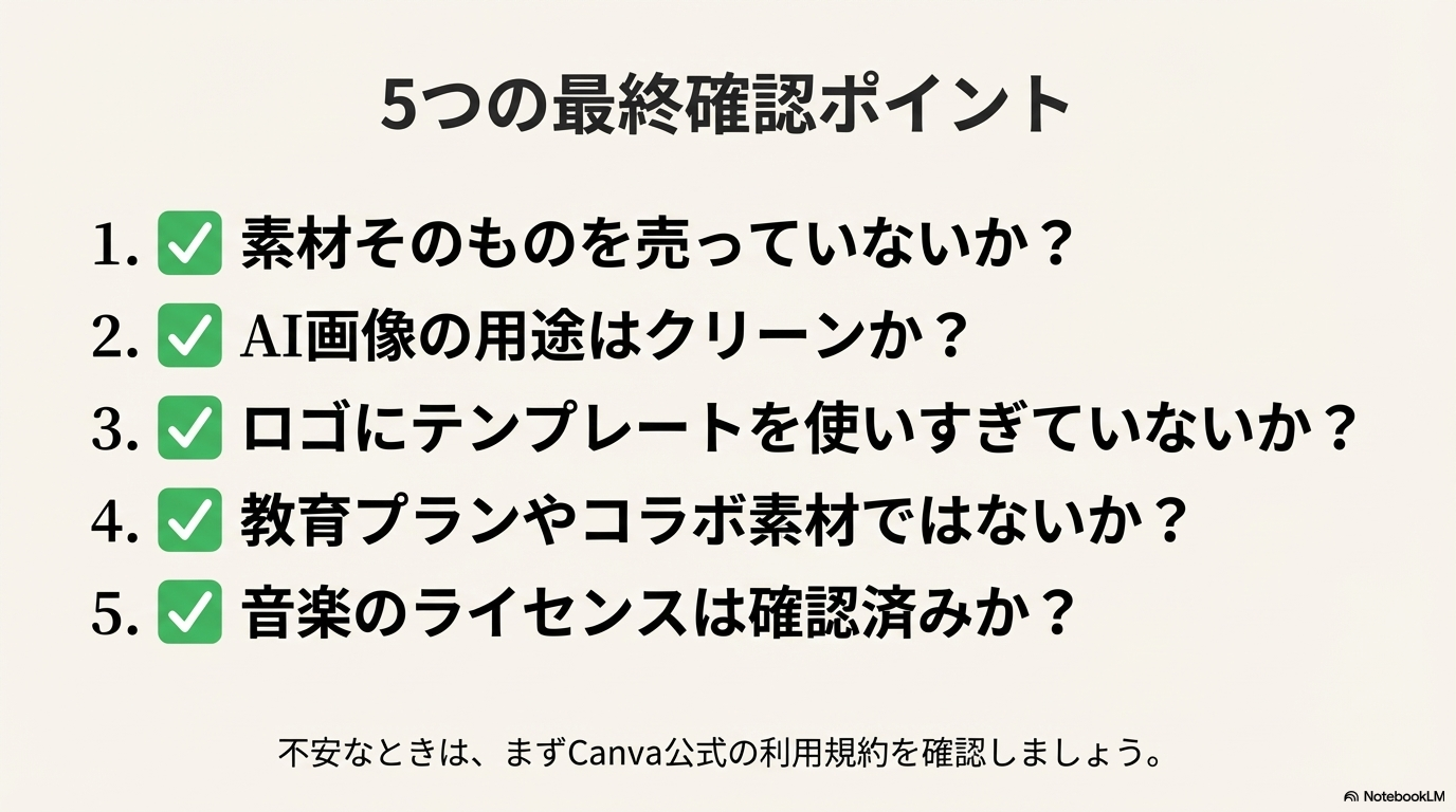 最後に、Canvaを使って作ったものを公開・販売するときに、最低限確認しておきたいポイントをまとめます。