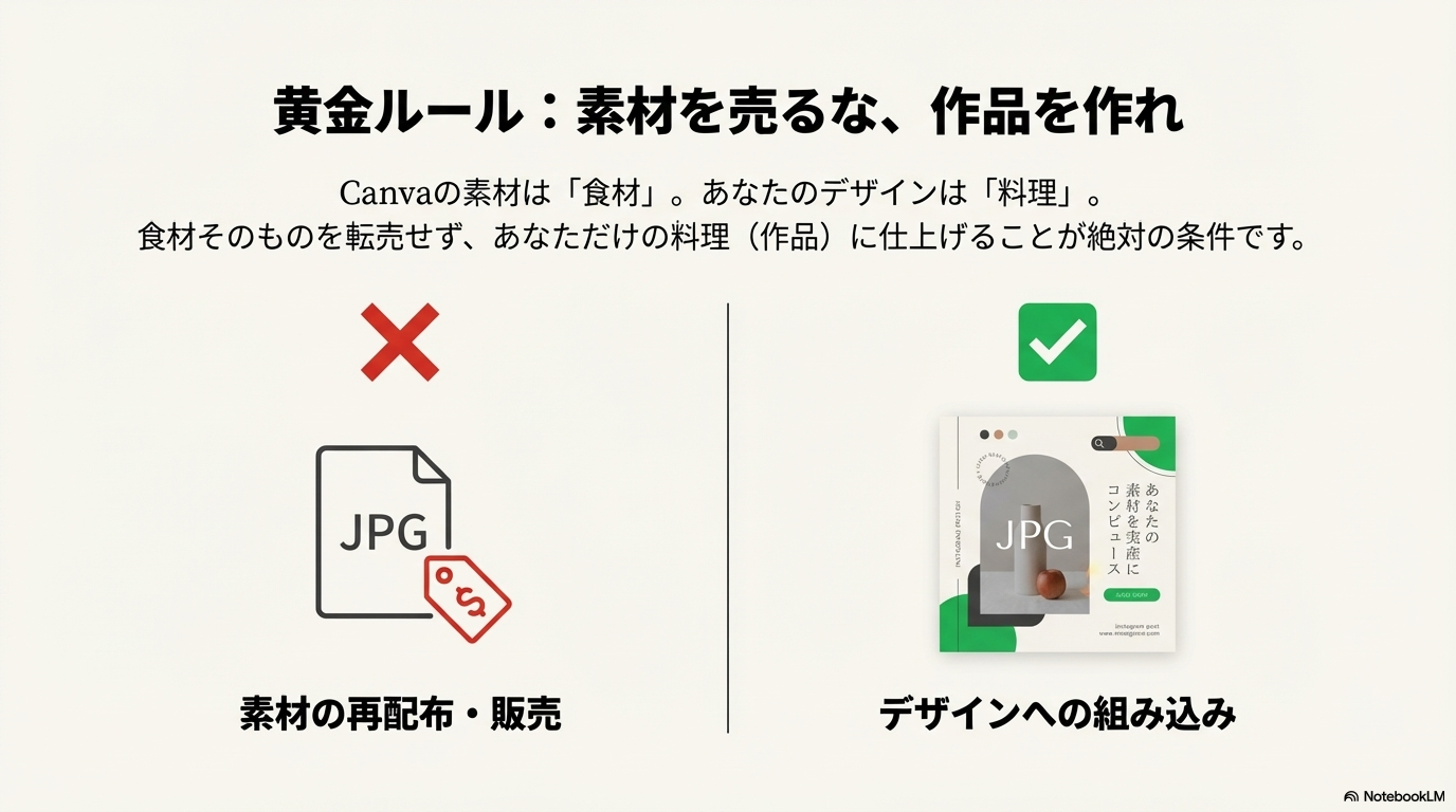 Canvaのライセンスで一番重要なルールが、「素材そのものの再配布・販売はNG」という点です。