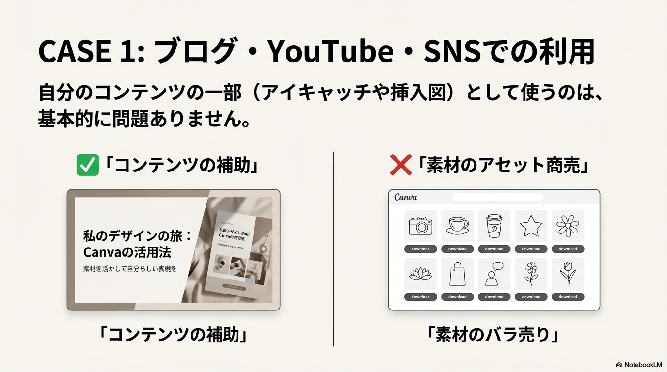 ブログや動画の「中身を分かりやすくするための部品」として使う分には問題になりにくいですが、「素材そのものを商品として扱い始める」とNGに近づいていく、と考えておくと安全です。