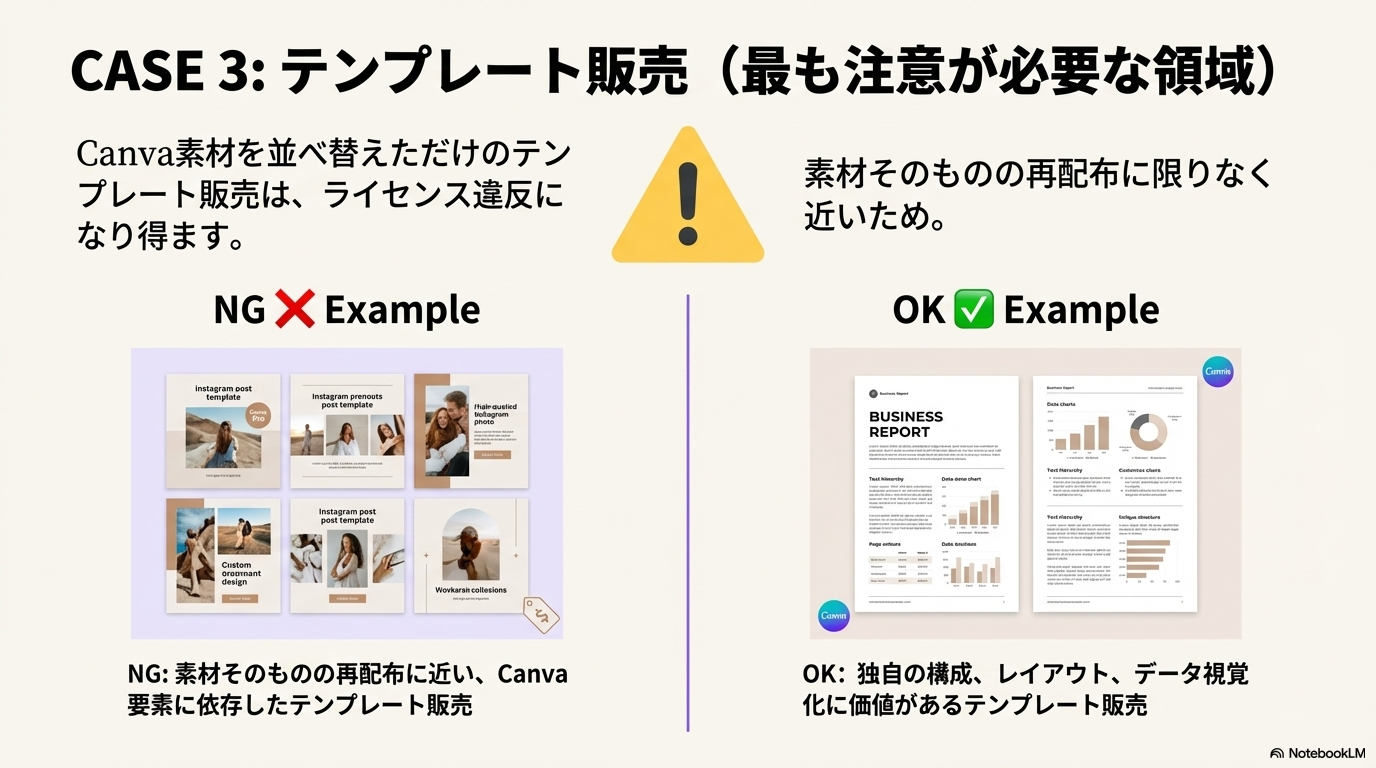 テンプレート販売についても同様です。 Canvaの素材を並べ替えただけのものを「有料テンプレート」として販売するのは、ライセンス違反になり得ます。 逆に、「自分で描いたイラスト」を中心に構成し、Canvaの機能はあくまで編集ツールとして使っている場合は、販売できる余地があります。かなりグレーゾーンが多い領域なので、「Canva素材に依存したビジネス」は避けるのが無難です。