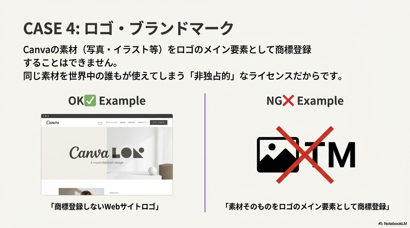 • ⭕ OKな使い方: 文字組みや形の調整に使い、商標登録しない「仮のロゴ」や「Webサイトのタイトルロゴ」として使う。