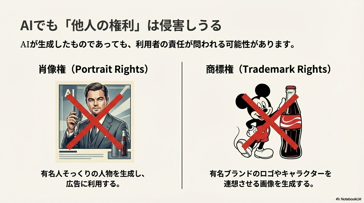 AI画像であっても、肖像権や商標権の問題から完全に自由だとは言えません。