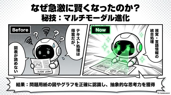 この飛躍的なスコア向上の背景には、「マルチモーダル能力(視覚・言語情報の統合処理)」の進化があります。