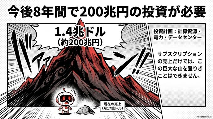 最先端のAIモデルを開発・維持し続けるために、開発元のOpenAI社は今後8年間で1.4兆ドル(日本円で約200兆円以上)もの巨額投資を計画していると報じられています。