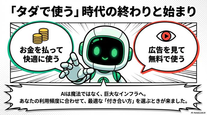 私たちはこれまで、魔法のようなAIツールを半ば実験的に無料で享受してきました。しかし、これからは「広告を見て無料で使う」か「対価を払って快適に使う」かを選択するフェーズに入ります。