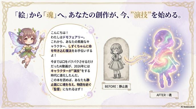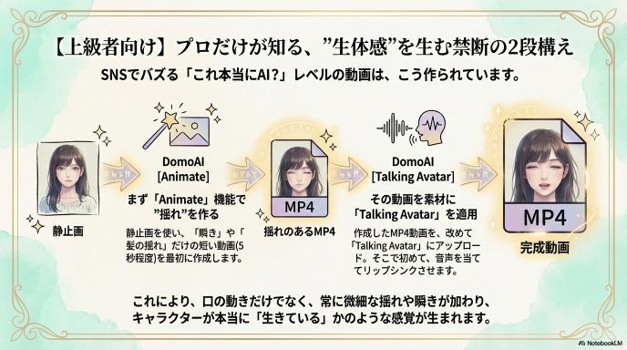 静止画に声を当てるだけでは得られない「生体感(瞬きや微細な揺れ)」が加わり、視聴者は「これ本当にAI?」と疑うレベルの映像になります。