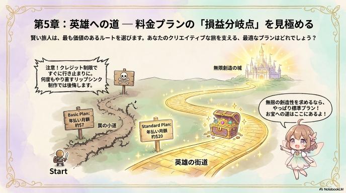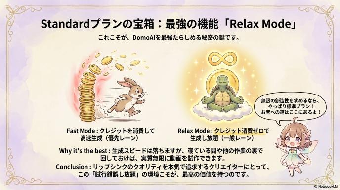 この一連のフローを使いこなせば、個人でもアニメスタジオ並みのコンテンツを生み出せる時代です。まずはStandardプランのRelax Modeで、納得いくまで「あなたのキャラクター」と対話してみてはいかがでしょうか。