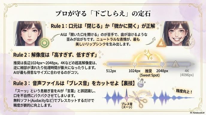 【裏技】 音声データ内の「スーッ」という息継ぎ音や、無音区間のノイズ。AIはこれを「言葉」として認識しようとし、口を不自然にパクパクさせてしまいます。