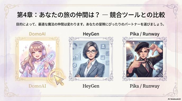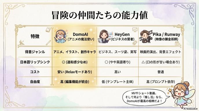 「DomoAI」の立ち位置を明確にするため、主要競合との違いを表で整理しました。