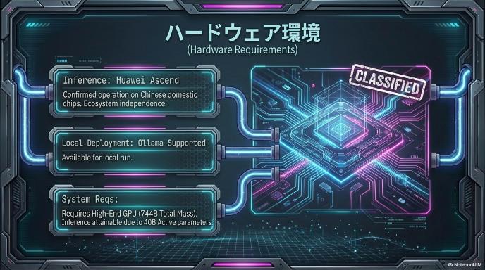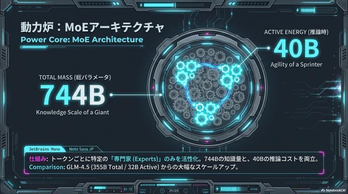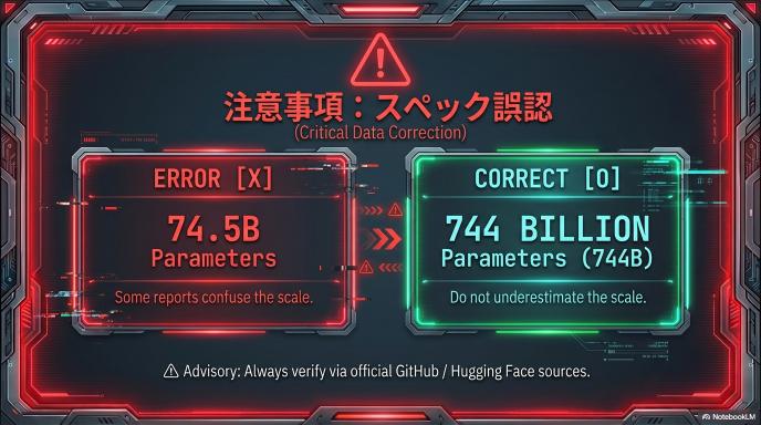 しかし、公式ドキュメント・Hugging Face・分析レポートのいずれにおいても、中核の数値は 総744B / アクティブ40B です。情報を引用・参照する際は、一次情報に基づく数値を優先することを強くお勧めします。