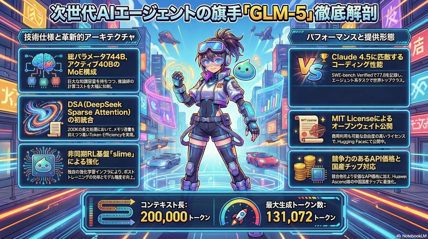 GLM-5は、MoEアーキテクチャの大規模化、DSAによる長文処理の効率化、非同期RLによるポストトレーニング強化という三本柱で、「エージェント時代のフラッグシップ」を目指すモデルです。