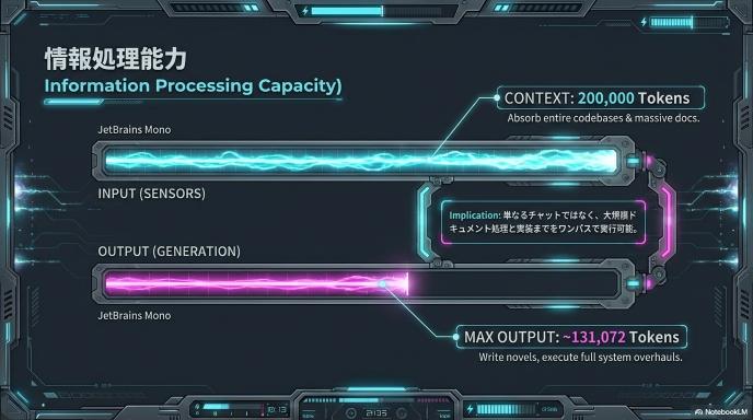 長大なコードベースや複雑なドキュメントを丸ごと扱えるだけの入力容量を持ちつつ、出力側も十分な長さを確保しています。