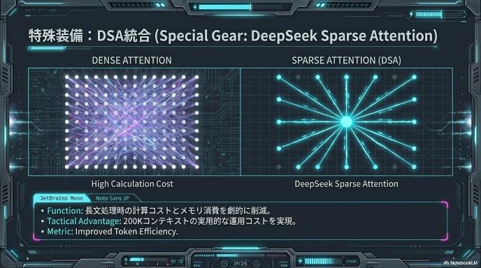 公式ドキュメントでは、DSA(DeepSeek Sparse Attention)を「初めて統合」したと明記されています。DSAはAttention計算をスパース化する手法で、長文処理時の計算量とメモリ消費を削減しつつ、性能劣化を最小限に抑えることを狙います。