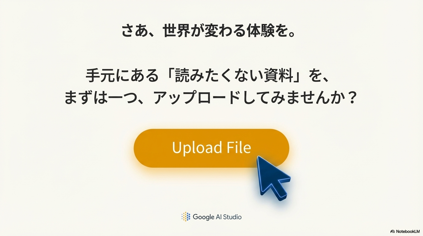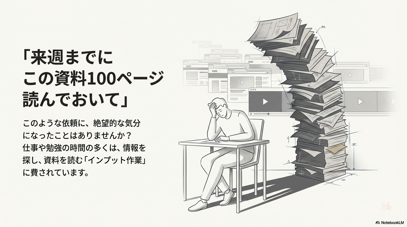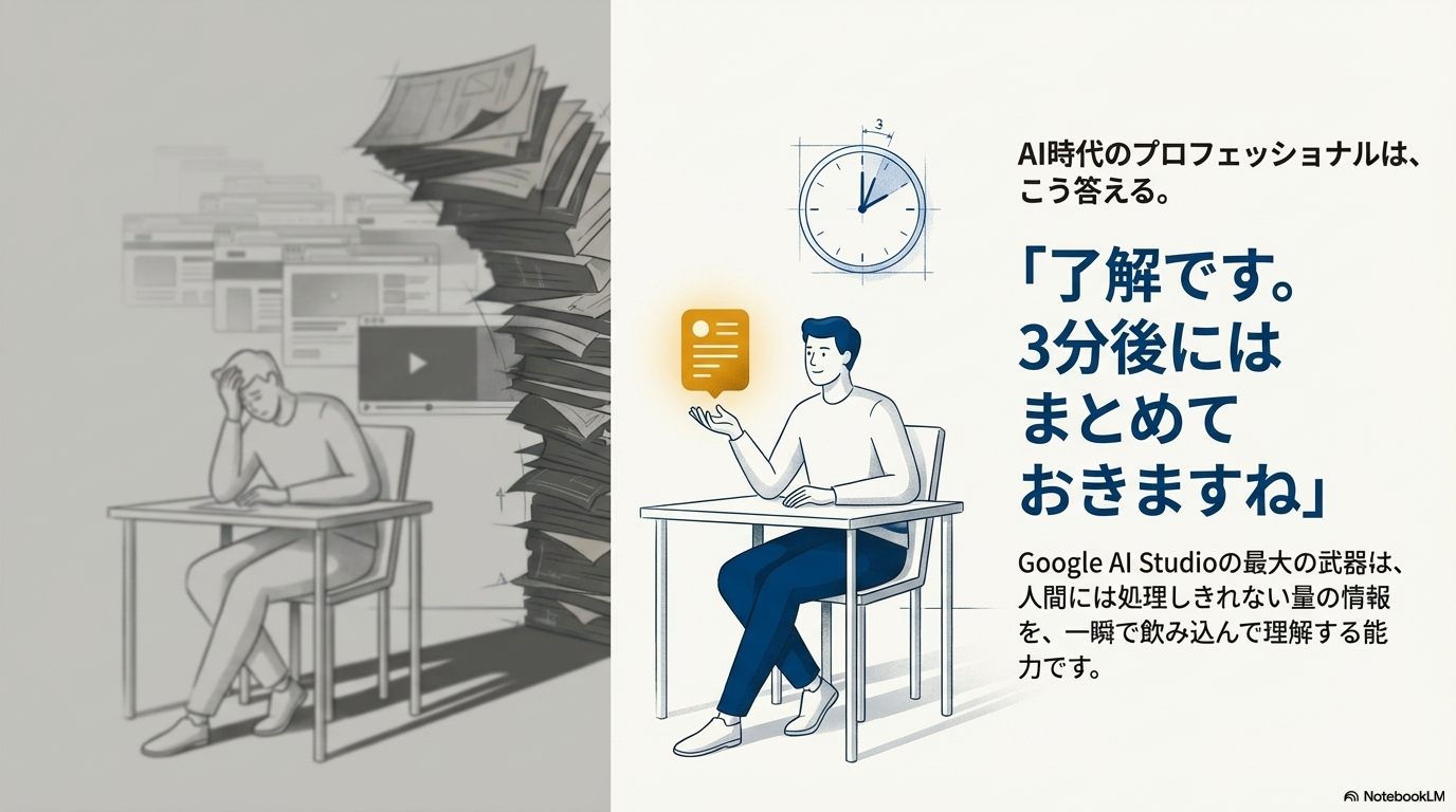 私たちは今まで、仕事や勉強の時間の多くを「情報を探す」「資料を読む」ことに使ってきました。 Google AI Studioを使えば、その**「インプットの時間」を劇的に短縮**できます。