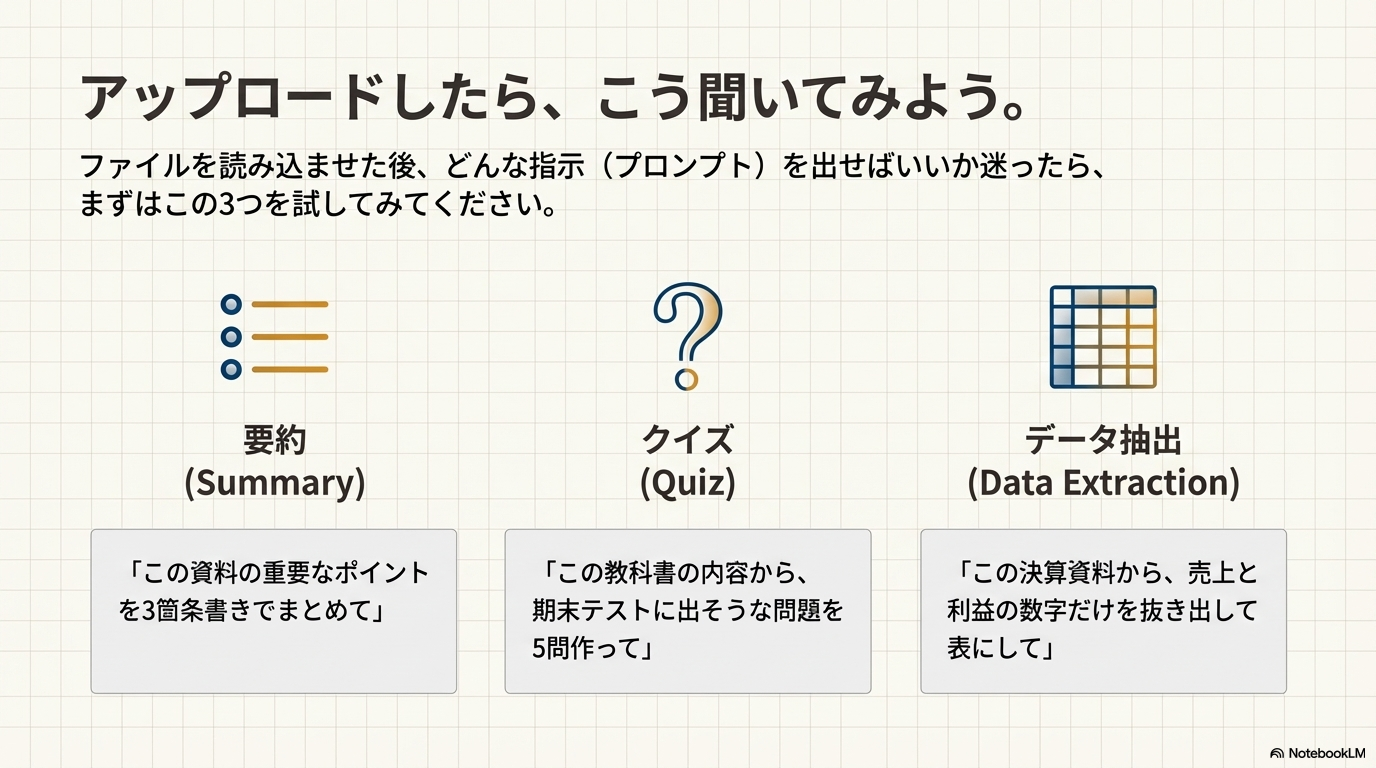 ファイル読み込み後のプロンプト例(要約、クイズ作成、データ抽出)