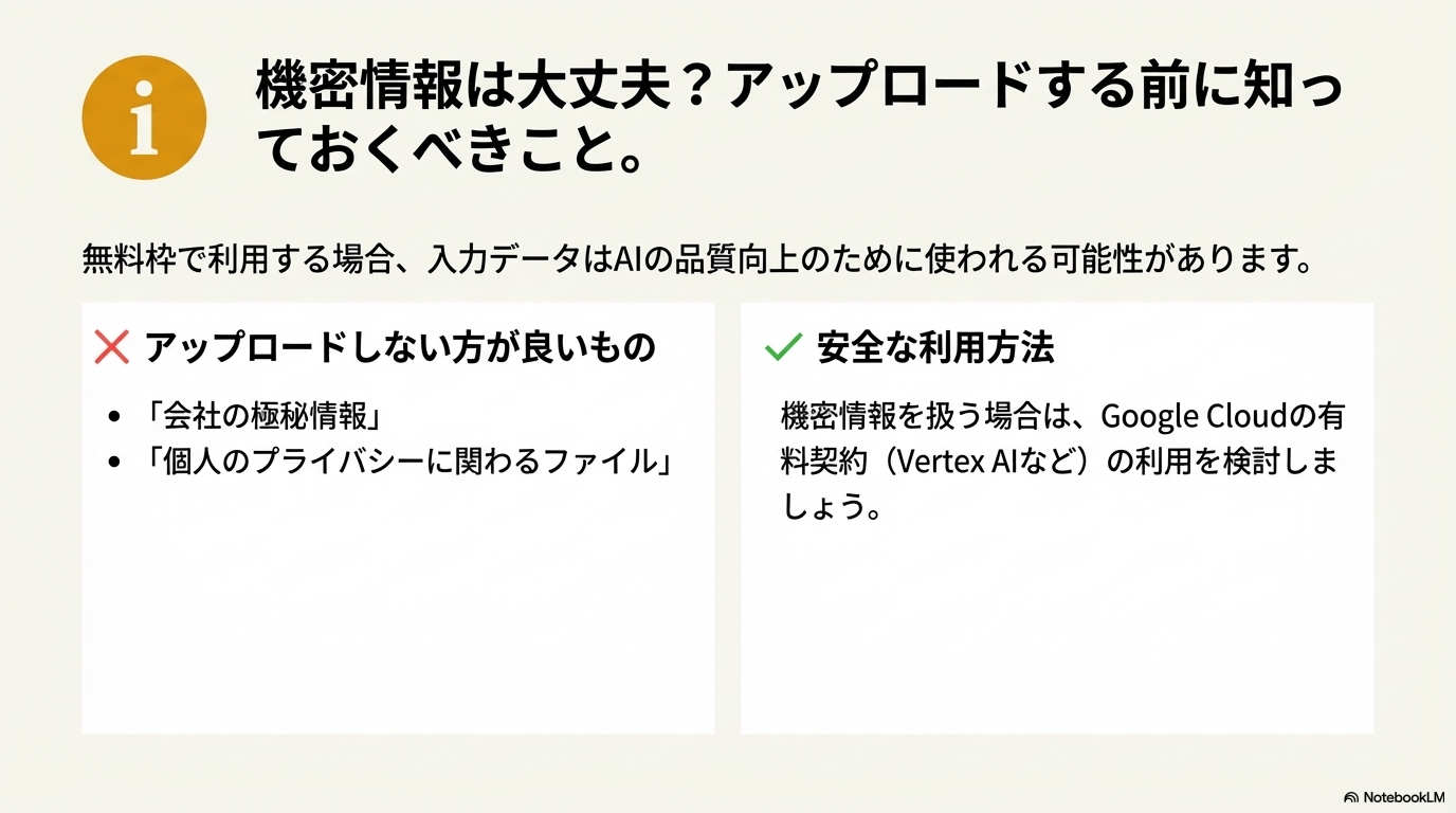 便利ですが、注意点もあります。 音声生成の時と同じく、無料枠で利用する場合、入力したデータはAIの品質向上のために使われる可能性があります。 「会社の極秘情報」や「個人のプライバシーに関わるファイル」はアップロードしない、もしくはGoogle Cloudの有料契約(Vertex AIなど)を利用するなど、情報の取り扱いには気をつけましょう。