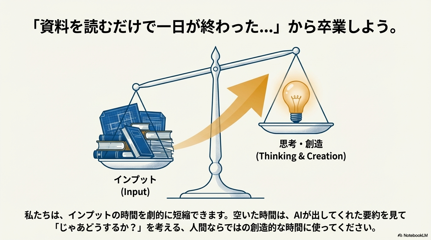 空いた時間は、AIが出してくれた要約を見て「じゃあどうするか?」を考える、人間ならではの創造的な時間に使ってください。