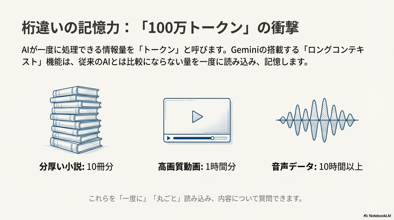 AI界隈でよく聞く「トークン」という言葉。これはAIが食べられる「言葉の量」の単位です。 普通のAIが「数千〜数万トークン(本1冊分くらい)」でお腹いっぱいになるのに対し、Geminiは「100万〜200万トークン」という桁違いの胃袋を持っています。