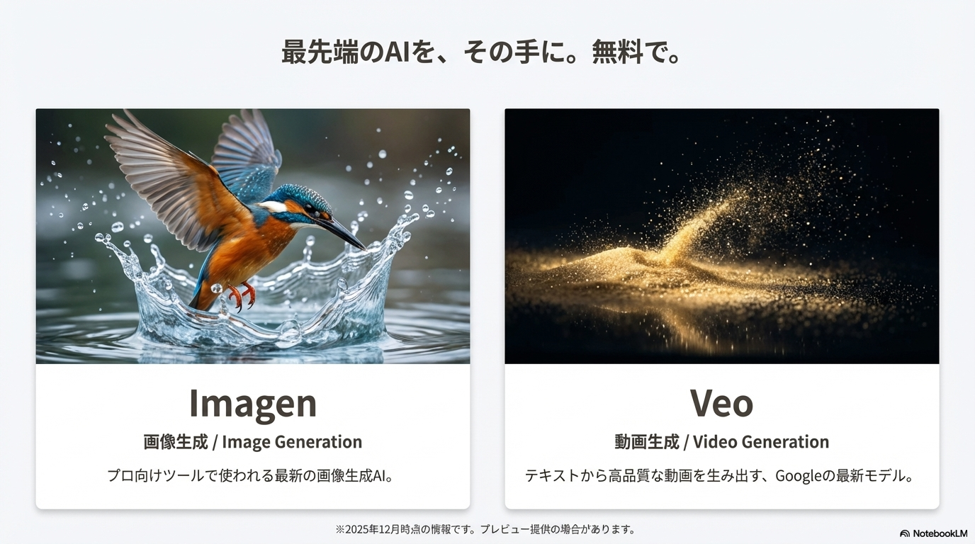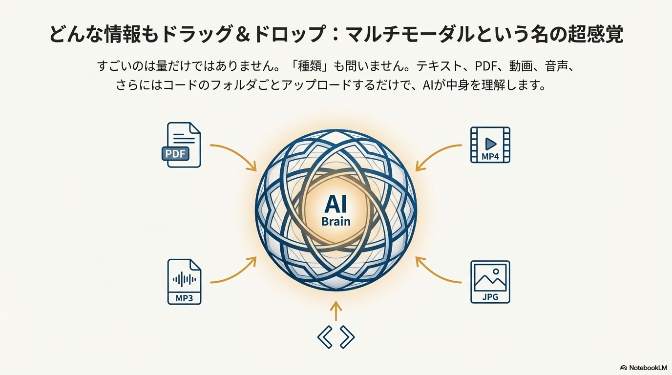これらをドラッグ&ドロップで放り込むだけで、Geminiは中身を勝手に見て、読んで、聞いて理解してくれます。これを専門用語で「マルチモーダル(多機能な感覚)」と呼びます。