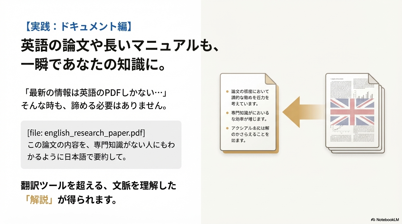 「最新の情報は英語のPDFしかない…」そんな時も諦める必要はありません。 英語のPDFをそのままGoogle AI Studioにアップロードし、チャット欄に日本語でこう書くだけです。