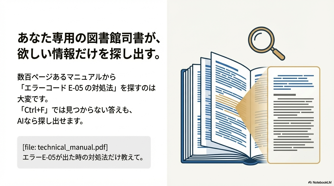 数百ページあるマニュアルから「エラーコード E-05 の対処法」を探すのは大変です。 GeminiにPDFを渡して「エラーE-05が出た時の対処法だけ教えて」と聞けば、該当箇所を探し出し、答えだけを教えてくれます。「Ctrl+F」の検索機能よりもずっと賢い、あなた専用の図書館司書の誕生です。