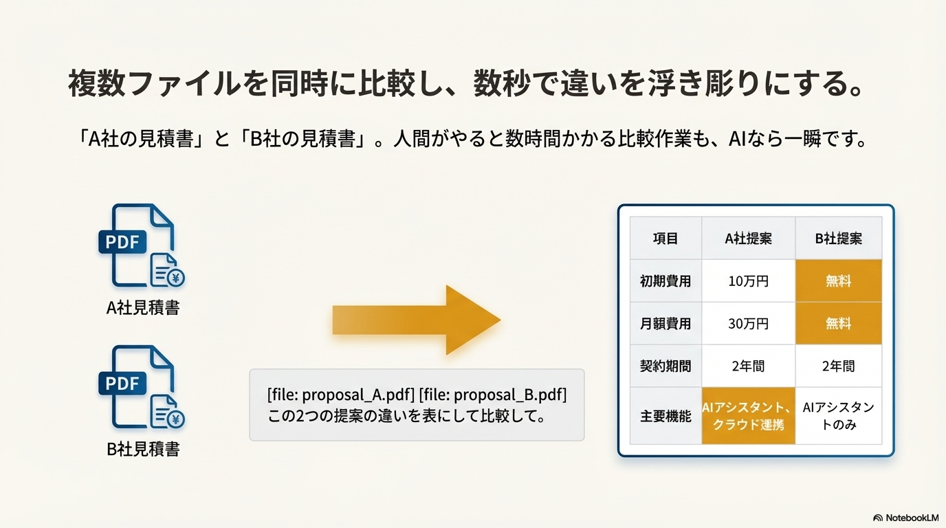 1つだけではありません。「A社の見積書」と「B社の見積書」の2つのPDFを同時にアップロードして、 「この2つの提案の違いを表にして比較して」 と頼むこともできます。人間がやると数時間かかる比較作業が、数秒で終わります。