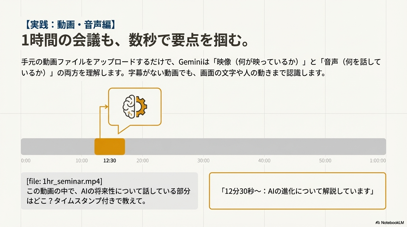 1時間のセミナー動画をアップロードして、こう聞いてみましょう。 「この動画の中で、AIの将来性について話している部分はどこ?タイムスタンプ付きで教えて」
