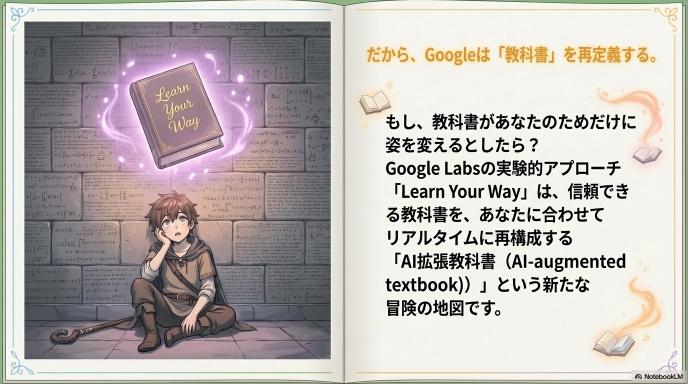 Google Labsで公開されている研究実験「Learn Your Way」は、既存の信頼できる教科書を、学習者一人ひとりの文脈に合わせてリアルタイムに再構成する試みです。 これは単なる「便利ツール」ではありません。学習科学(Learning Science)における長年の課題であった「個別最適化(Personalization)」と「スケーラビリティ」の両立に対する、Googleからの技術的回答と言えます。