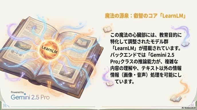 このシステムの中核を担うのは、汎用モデルではなく、教育目的に特化して調整されたモデル群「LearnLM」です。 2025年後半のアップデートにより、バックエンドにはGemini 2.5 Proクラスの推論能力が統合されていると言及されています。これにより、単なるテキスト生成だけでなく、複雑な論理構造の理解や、マルチモーダル(画像・音声)処理において高いパフォーマンスを発揮します。