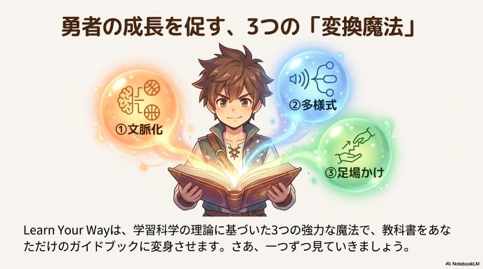 技術レポートによると、Learn Your Way は学習科学の理論に基づき、以下の3つのレイヤーで教科書を動的に変換しています。