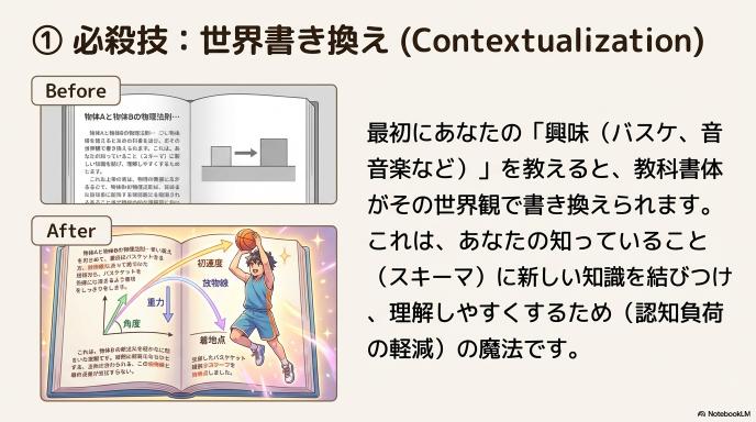 学習者が最初に「自分の興味(例:バスケットボール、音楽、ゲーム)」を入力すると、AIは教科書の本文全体をその文脈に沿って書き換えます。