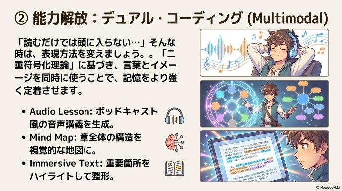 「テキストを読むだけでは頭に入らない」という学習者のために、二重符号化理論(Dual Coding Theory)——言語情報と非言語情報を同時に処理することで記憶定着が高まるという理論——をシステムレベルで実装しています。