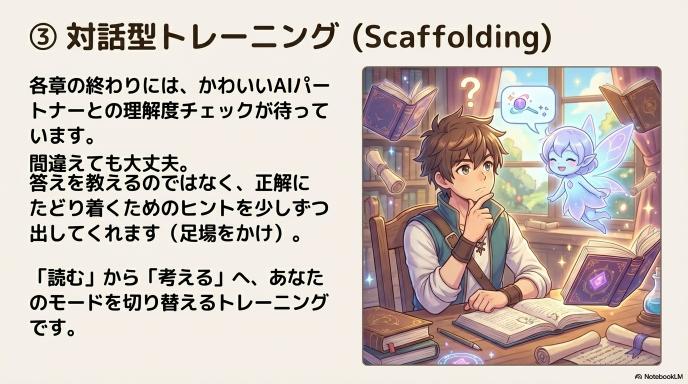 各セクションの終わりには、AIによる理解度チェック(クイズ)が挟まれます。 ここで重要なのは、不正解時の挙動です。単に答えを表示するのではなく、「なぜ間違えたのか」「どの概念の理解が不足しているか」を分析し、正解に辿り着くためのヒントを段階的に出します(足場かけ)。 これにより、学習者は受動的に「読む」状態から、能動的に「考える」状態へと移行させられます。
