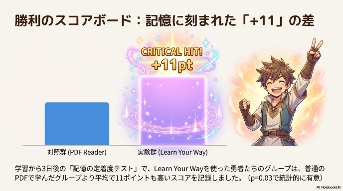 直後のテストでも実験群が高得点でしたが、特筆すべきは学習から3日後に行われた「保持テスト」の結果です。 Learn Your Wayを使用したグループは、対照群と比較して平均で11ポイント高いスコアを記録しました(p=0.03で統計的有意)。