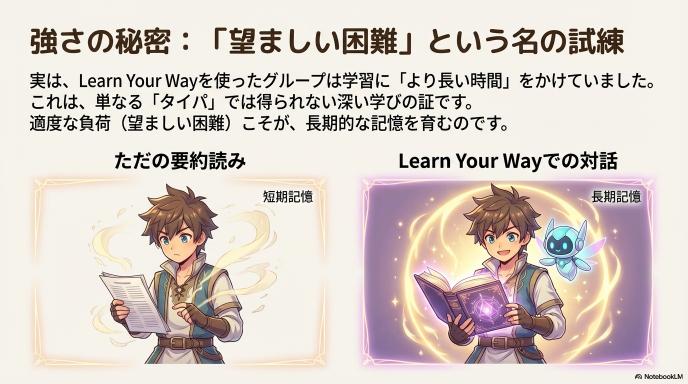 興味深いことに、実験群は対照群よりも学習に「長い時間」を費やしていました。 これは、チャットボットとの対話や、興味に基づいた書き換えテキストを読むことによる「望ましい困難(Desirable Difficulties)」——学習時に適度な負荷がかかることで、かえって長期記憶への定着が促進される現象——が起きていた可能性があります。 「タイパ(時間対効果)」重視で要約を読むだけでは得られない、「深い学習」が達成されたことを示唆するデータです。