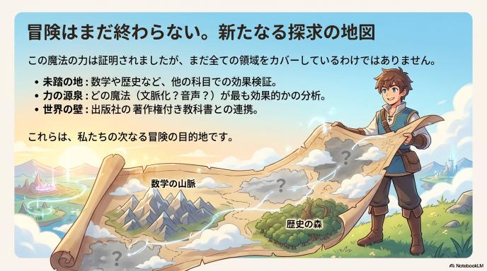 - 「どの機能」が効いたのか?: 音声なのか、書き換えなのか、クイズなのか。どのコンポーネントが11ポイント差の主因なのか、因子の切り分け(Ablation study)はまだ完全ではありません。