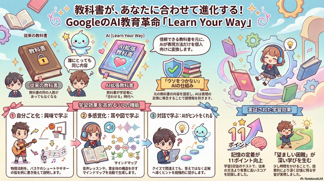 Google Learn Your Way が示している未来は、AIが人間に代わって勉強してくれる世界ではありません。むしろ、「人間が勉強しやすくするために、教科書側が汗をかく」世界です。