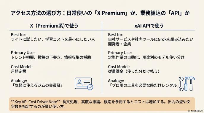 さらに、実際に使ううえで避けたい落とし穴(間違いっぽい答えの見抜き方、リアルタイム情報の扱い方)や、Xで使うのが向く人/APIで使うのが向く人まで、迷いが減るように整理します。