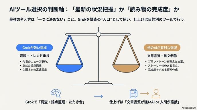 Grokは“入口”として強い。調べて、全体像を掴んで、論点を整理する。そこから先は目的に応じて、仕上げ方を選べばいい。