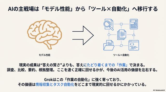 だから最近のAIは、答えの文章よりも「作業そのものを進める力」が重視されます。Grokがエージェント方向に寄ってきたのは、まさにここです。