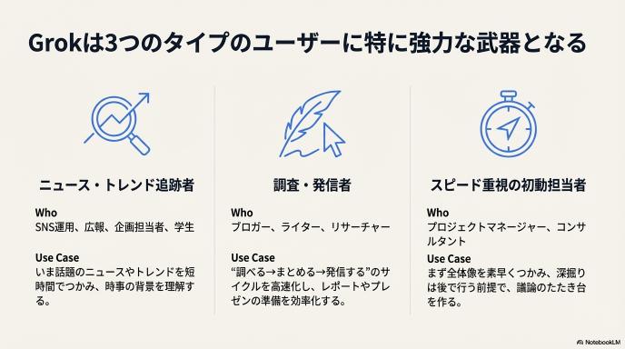 この領域はスピード勝負になりやすいので、Grokの「検索×要点整理」が活きます。特に「全体像を先に掴む」用途では、強い選択肢になりやすいです。