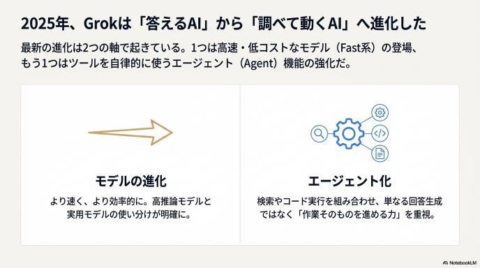 2025年のGrokは、「モデルが賢くなる」だけでなく、“調べて動くAI”へ進化してきました。ポイントは大きく2つです。