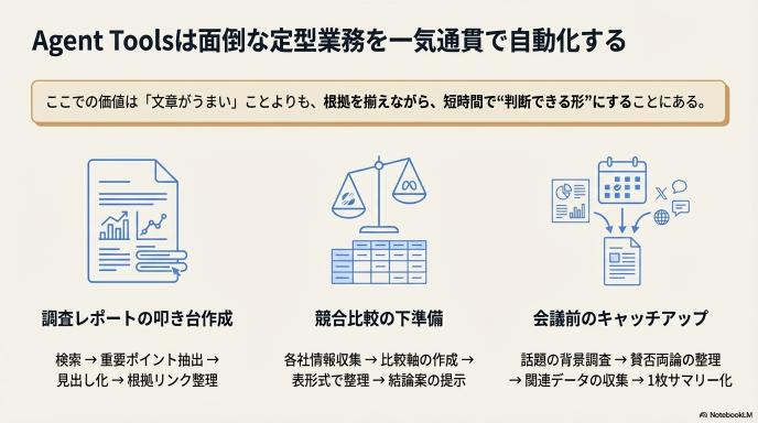 Agent Toolsが刺さるのは、次のような“いつも面倒なやつ”です。