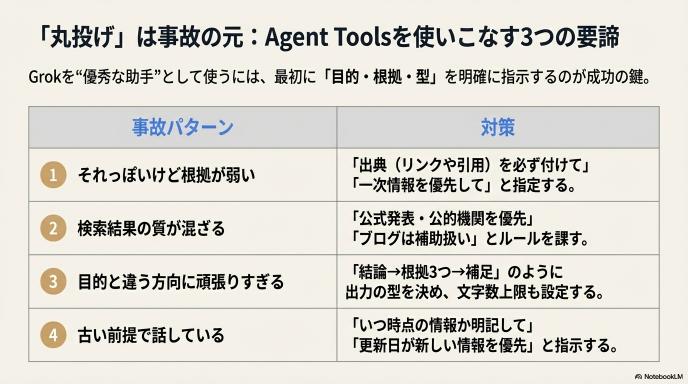 次の章では、この「料金と性能のバランス」を踏まえて、Grokを安全に使うための注意点(間違いの見抜き方、丸投げ事故の防ぎ方)を具体的に整理していきます。