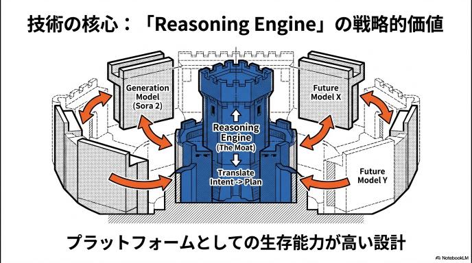 仮に将来、Soraより優れたモデルが他社から出ても、この推論層があれば「エンジンを載せ替える」だけで対応可能。プラットフォームとしての生存能力が高い設計になっています。