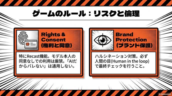 • ブランドの保護: トレンドに乗るあまり、過激な表現や嘘(ハルシネーション)が含まれないか、人間の目での最終チェック(Human in the loop)は必須です。
