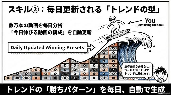 SNSの流行り廃りは激しいですが、Higgsfieldは日々何万本もの動画データを分析し、「今日伸びる動画の構成(プリセット)」を毎日更新しています。ユーザーは流行を追いかけなくても、ツールを使うだけでトレンドに乗れます。